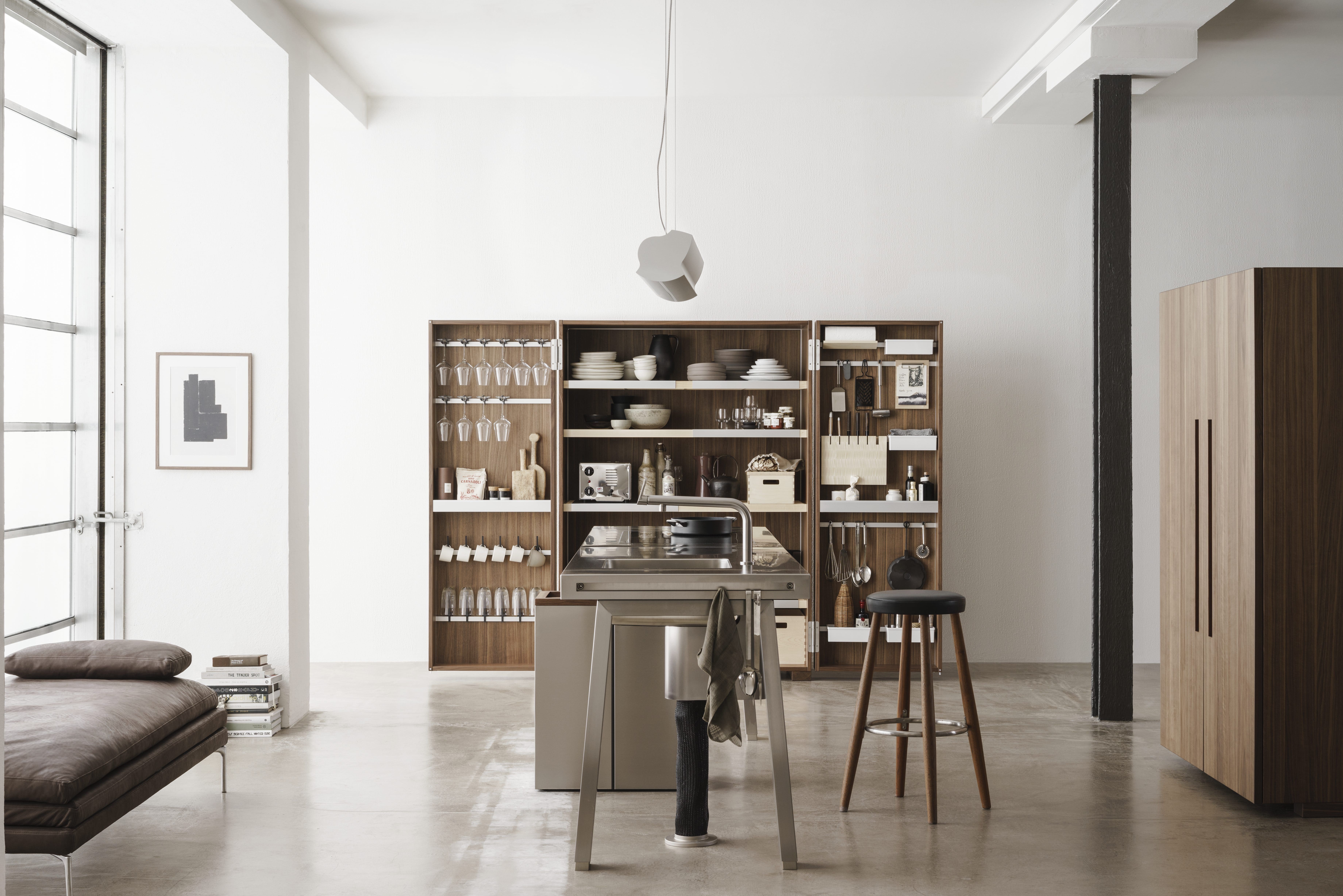 Eldhússkápur fyrir geymslu er fágaður og í góðu jafnvægi við vinnuborðið, þegar hann er lokaður. Þannig nýtur vinnuborðið sín sem best. Þegar eldhússkápurinn er opnaður sést hin raunverulega hugvitssama hönnun á bak við bulthaup b2 línuna. Hönnuðir bulthaup hafa skapað hin fullkomnu geymsluskilyrði. Útkoma þessarar snjöllu samþjöppunar á geymslurými hefur í för með sér hægkvæmari nýtingu á plássi en litlar eldhúsinnréttingar hafa upp á að bjóða.